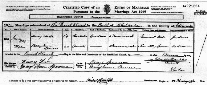 Marriage Certificate of Henry Hale and Mary Ann Spencer.