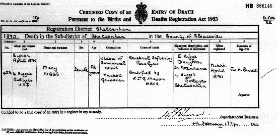 (The age given on this certificate is incorrect, Mary must have been many years older than 52 in 1890. Possibly the Registrar mis-heard the informant. There could be another explanation - if Mary Higgs nee Daniels died some years earlier and Emanuel married again also to a Mary then this could be her death. We have no knowledge of another marriage, but to be sure a search of the General Register Office Indexes would need to be carried out.)