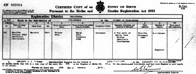 Birth Certificate of Harriet Poole.